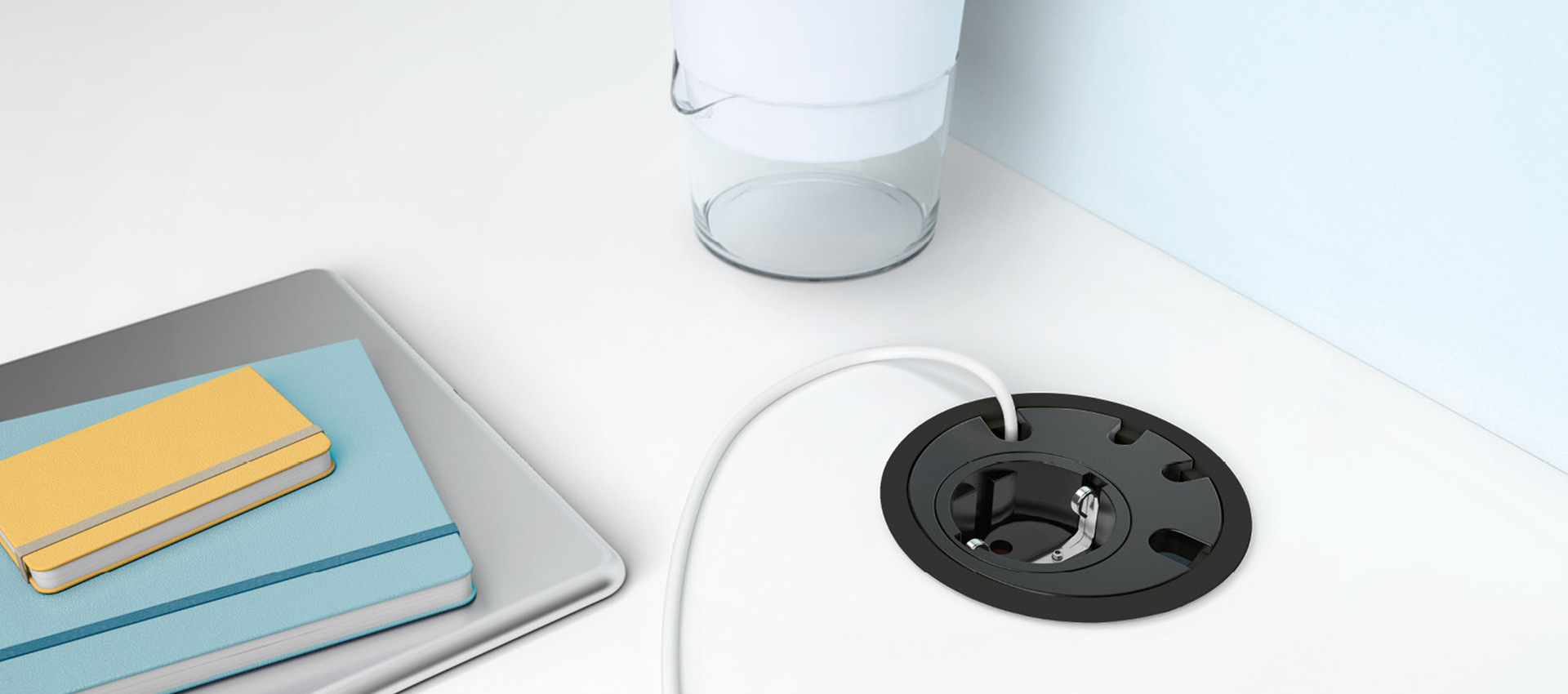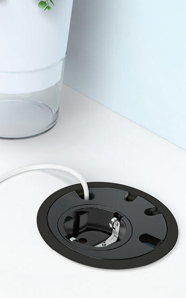 Organising and guiding cable module, equipped with socket outlet with earthing contact, with a modern and elegant design.